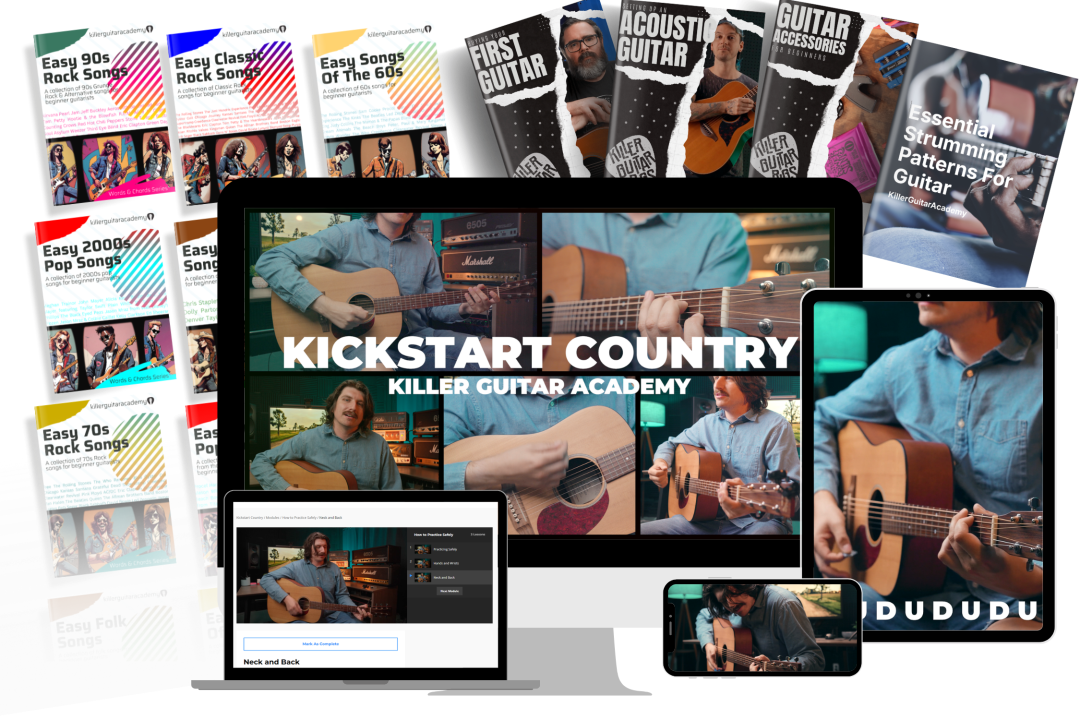 Over three hours of video lessons, taking you from holding a guitar for the first time, to playing the country songs you love.